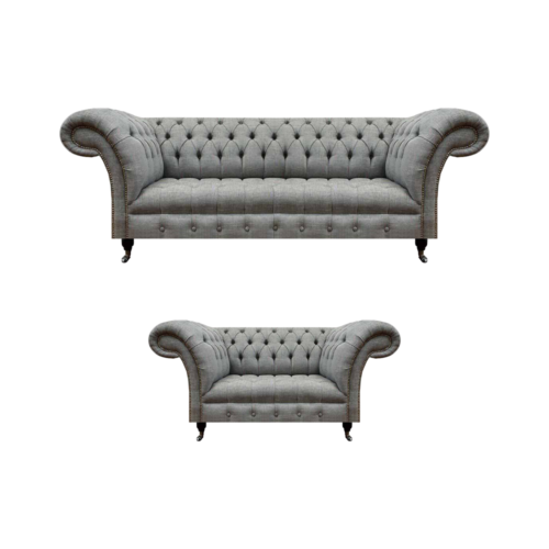 Sofá de tres plazas completo Chesterfield gris con sillón de lujo nuevo