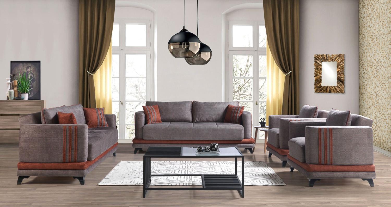 Diseño moderno de sala de estar. Conjunto de sofás 3+2+1+1 en gris. Juego de muebles de sala de estar.