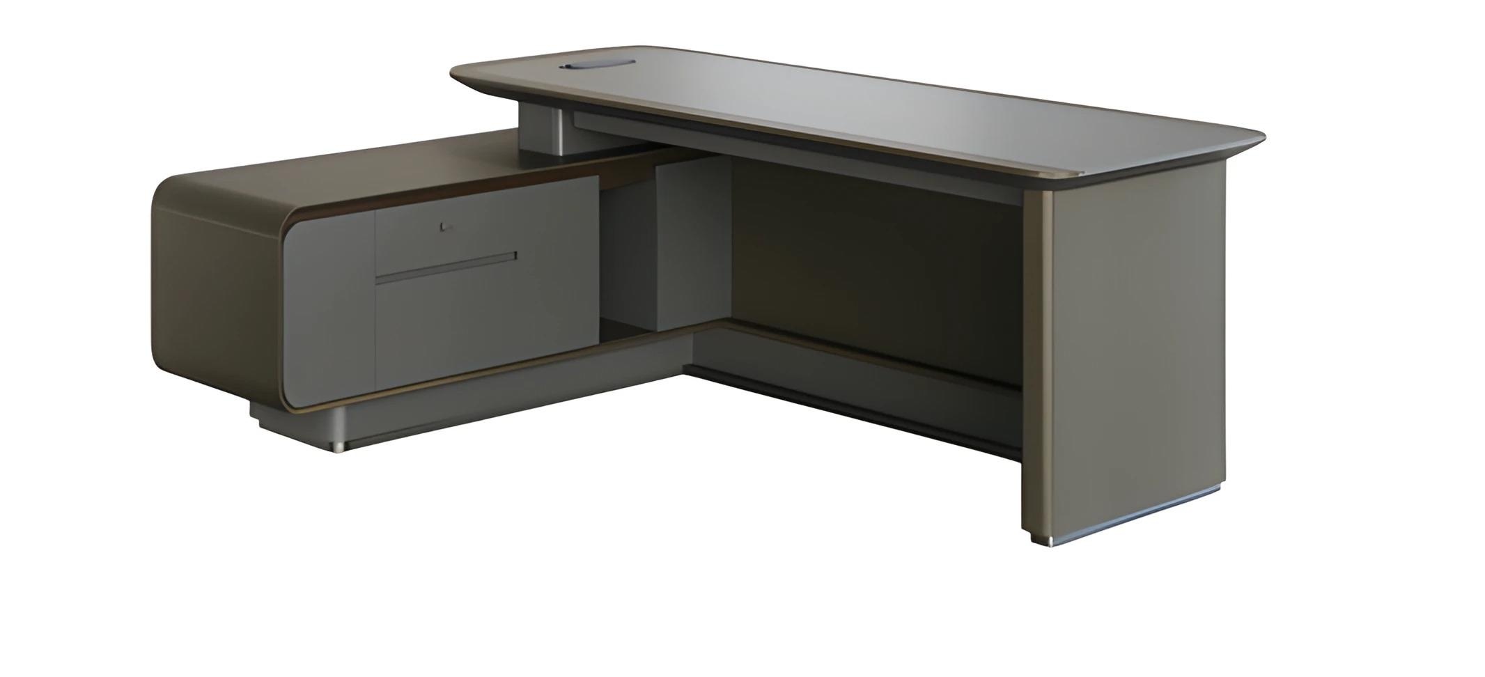 Moderna mesa de esquina en color gris con espacio de almacenamiento