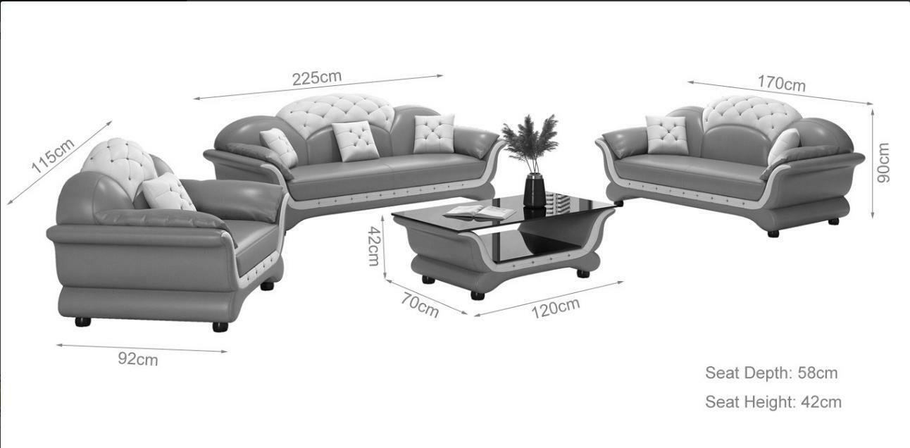 El 'Juego completo de conjunto de sofá 321 asientos, mesa de centro, diseño de sala de estar 4 piezas. Nuevo.' es la solución perfecta para transformar tu sala de estar en un espacio sofisticado y cómodo. Este conjunto incluye un sofá de tres plazas de aproximadamente 225 cm de largo, uno de dos plazas de 170 cm y un sillón individual de 115 cm, todos complementados con una mesa de centro de 120 cm. Fabricados con material de fibra de cuero premium que combina el 70% de cuero genuino y 30% de poliéster, estos muebles ofrecen una experiencia de lujo a un costo accesible. Para aquellos que desean opciones personalizadas, existe la posibilidad de seleccionar entre cuero genuino italiano, tela textil o incluso cuero completo premium con un cargo adicional. Cada pieza está cuidadosamente diseñada con estructuras interiores de madera auténtica, asegurando no solo estética sino también durabilidad.
