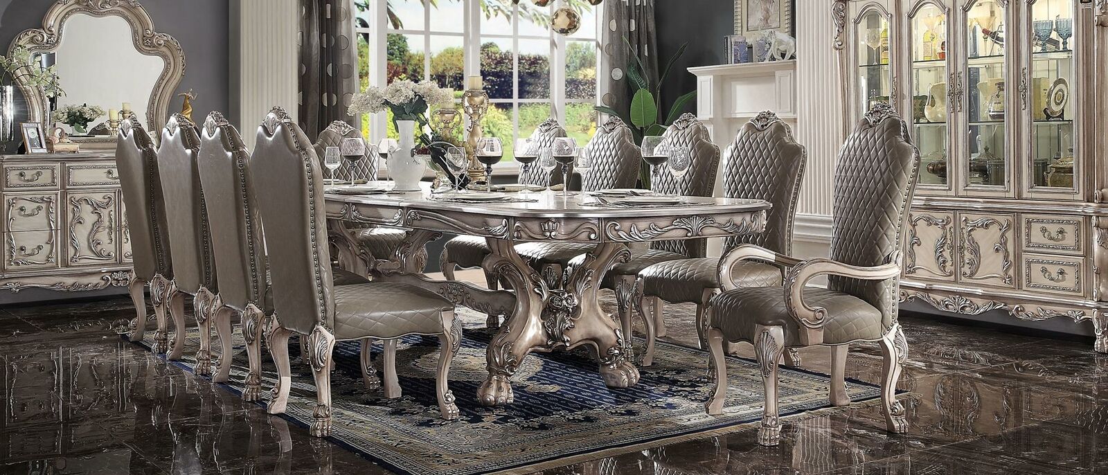 Conjunto completo de comedor que incluye una elegante mesa de comedor en estilo barroco, un espacioso aparador, un conjunto de 10 sillas (8 sin brazos y 2 con brazos), una vitrina y un espejo, todo en un juego de 14 piezas. El magnífico diseño y la calidad de la madera hacen de este conjunto una adición impresionante a cualquier comedor. La mesa de comedor destaca por sus dimensiones generosas de 345.5 x 115 x 77.7 cm, mientras que las sillas, aparador y vitrina ofrecen un equilibrio perfecto entre estilo clásico y funcionalidad moderna. Con este conjunto, disfrutarás de cenas y reuniones elegantes en un ambiente que refleja sofisticación y lujo.