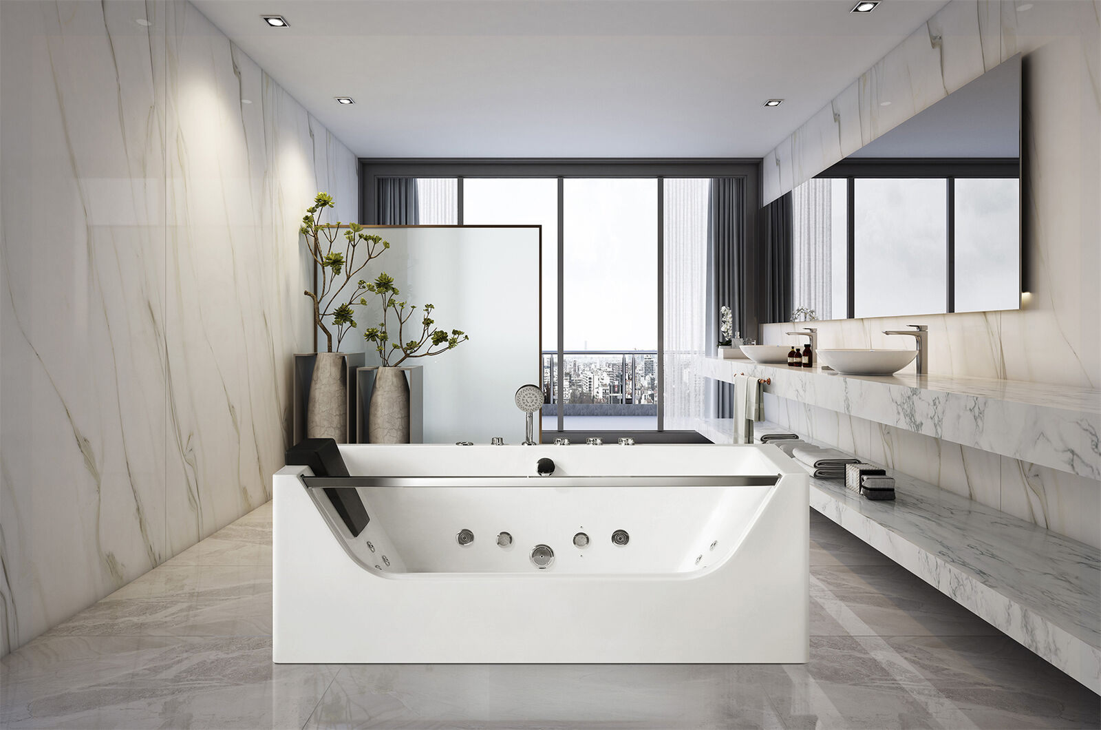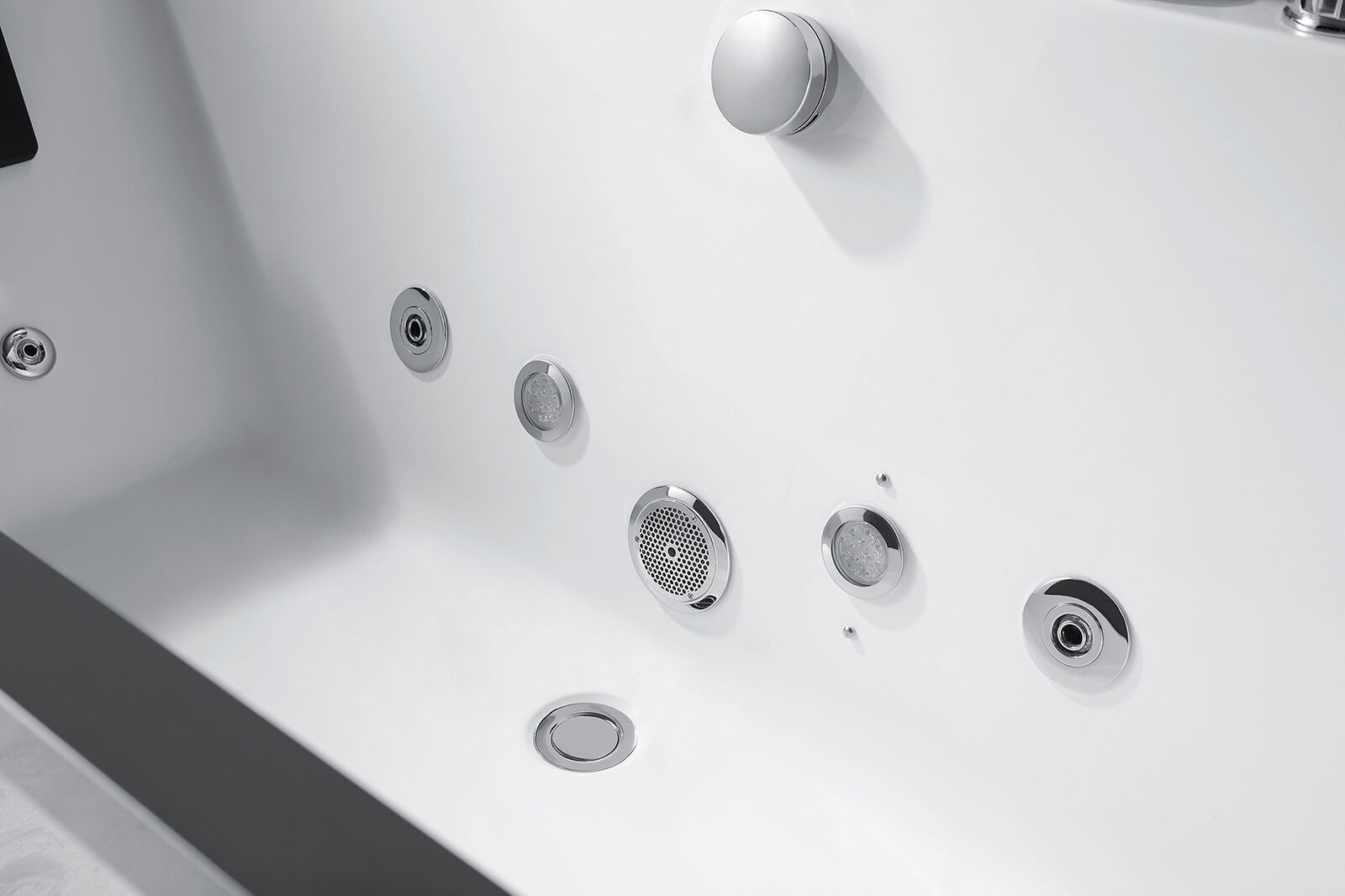 Las opciones adicionales incluyen luz de color subacuática, masaje con burbujas de aire, tuberías autolimpiantes y calefacción termostática para una experiencia personalizada. La esterilización con ozono y el panel de control táctil digital con funciones como Radio FM, Bluetooth y altavoces, añaden un toque de modernidad a esta bañera de lujo. Disfrute de momentos de relax y confort en su hogar con el Baño de remolino Bañera Burbujeante Jets de masaje Bienestar Confort.