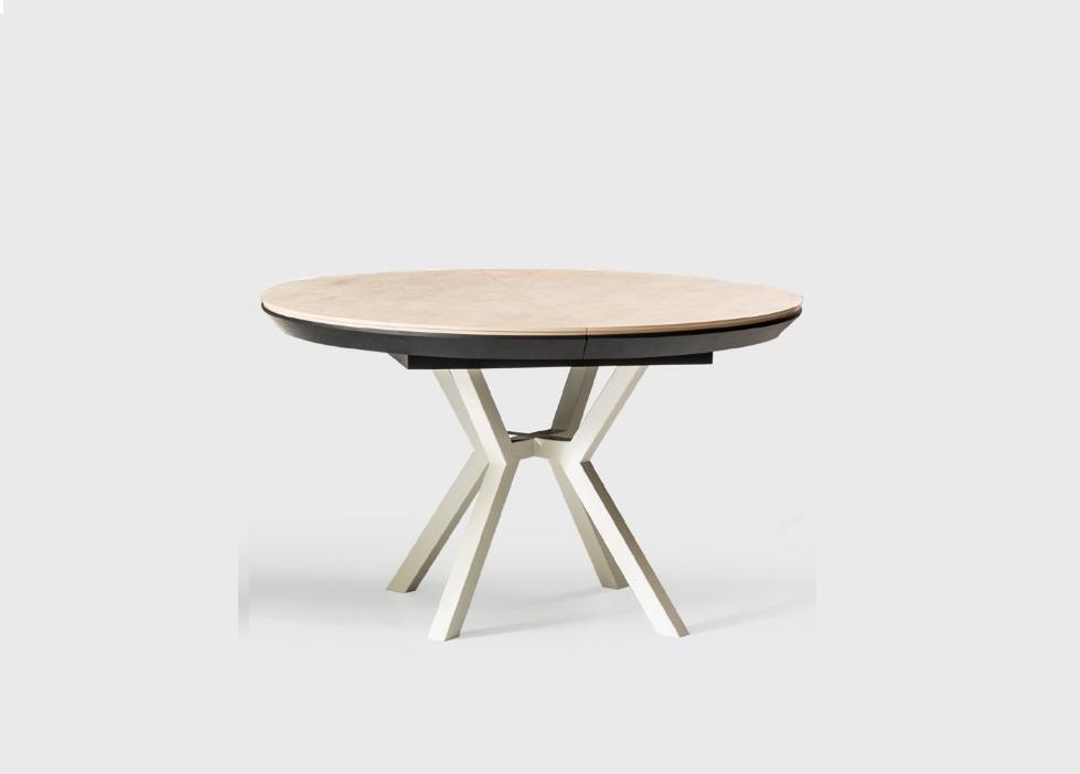 Mesa de comedor moderna extensible redonda de madera beige.