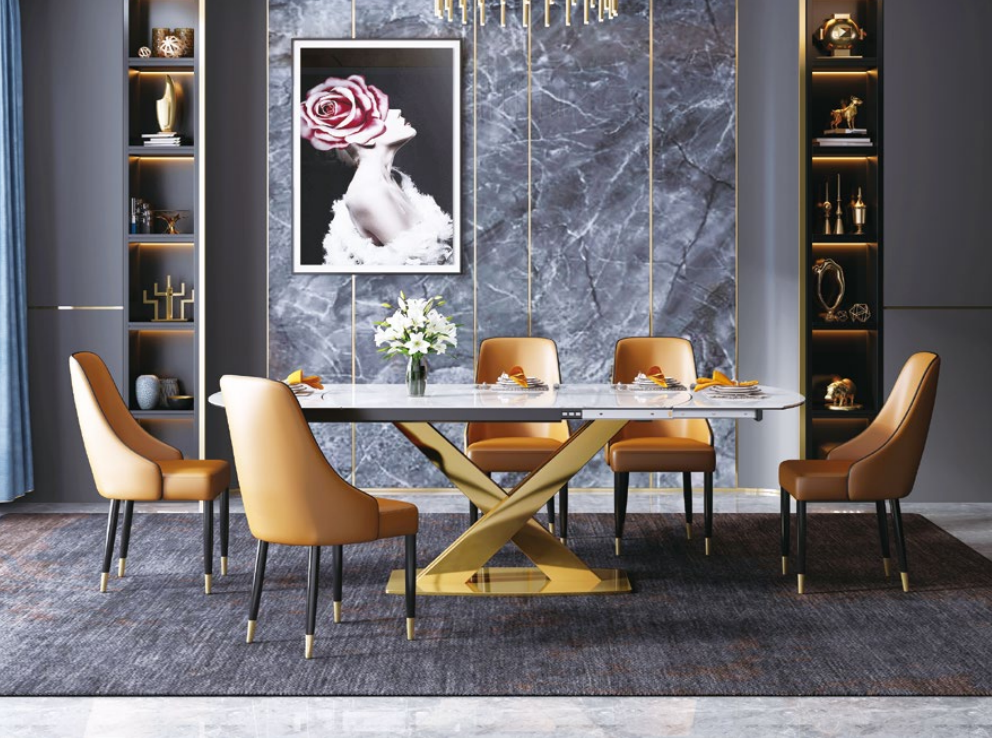 La Moderna mesa de comedor de madera, con un elegante diseño que se adapta a cualquier hogar contemporáneo, es una elección ideal para su comedor. Con medidas compactas de aproximadamente 120 cm de longitud, esta mesa es perfecta para cenas íntimas, pero gracias a su función de extensión puede ampliarse hasta 180 cm, ofreciendo espacio suficiente para reuniones familiares o eventos especiales. Fabricada en imitation de mármol y reforzada con acero inoxidable, asegura una durabilidad excepcional y un estilo sofisticado que captará miradas.