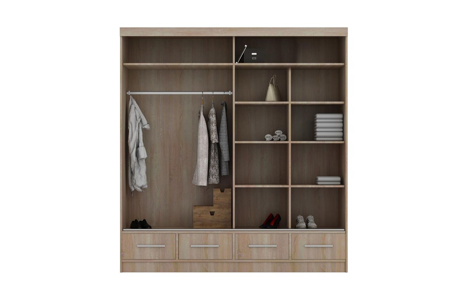 Armario grande con cajones de diseñador con estantes, cómoda y armario.