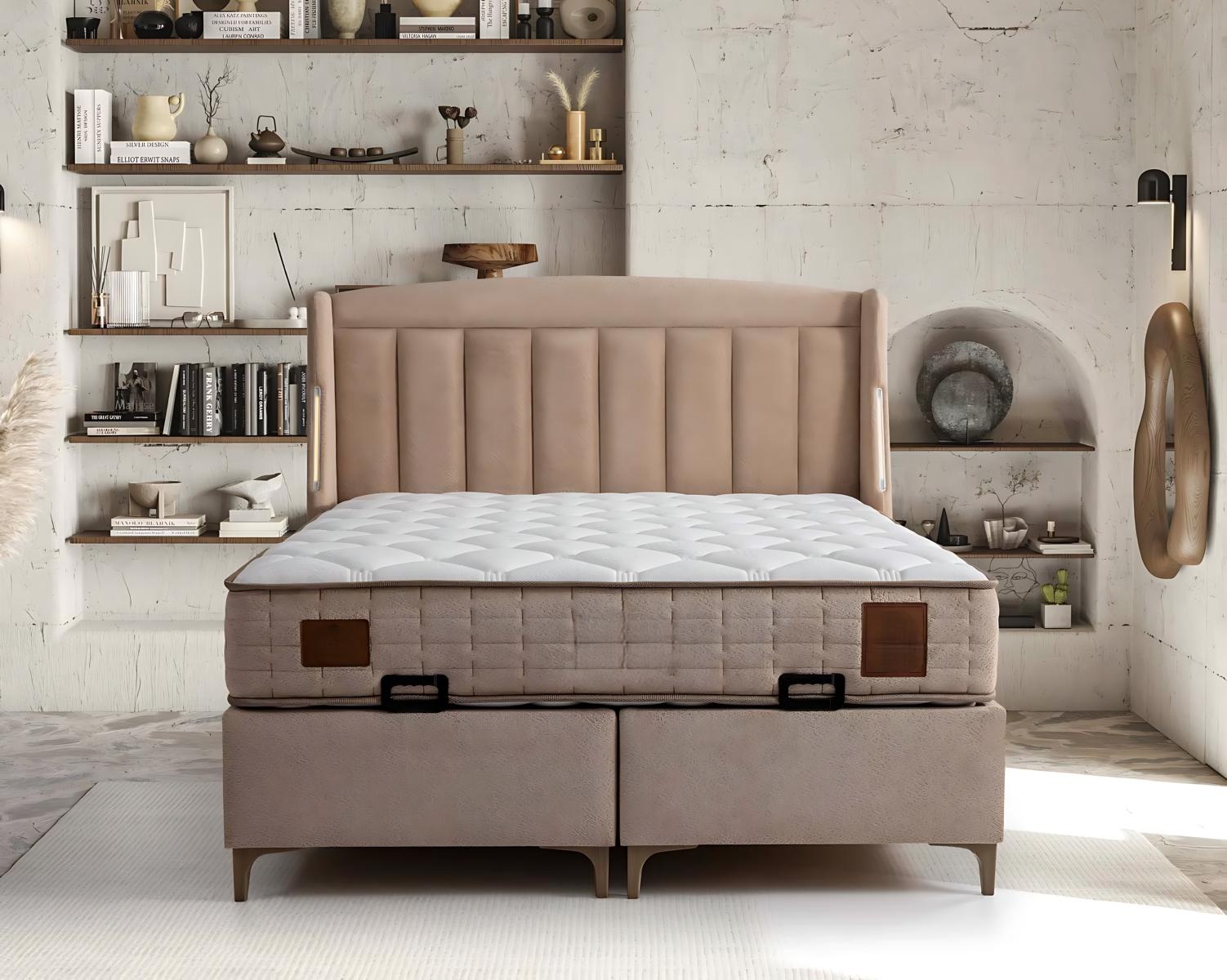 La cama elegante de madera con colchón de textil y madera es la culminación del arte del descanso. Su diseño sofisticado en un cálido tono marrón no solo embellece su dormitorio, sino que también establece un ambiente de exclusividad y confort. La estructura robusta, elaborada con madera de la más alta calidad, garantiza durabilidad y estabilidad, mientras que el colchón de textil proporciona un soporte excepcional para un sueño reparador. Esta pieza, resultado de dos décadas de maestría en mobiliario de lujo, no es solo un mueble, sino una declaración de estilo. Cada detalle ha sido cuidadosamente pensado para reflejar un estilo de vida refinado, convirtiéndola en la elección ideal para quienes valoran la elegancia en cada rincón de su hogar.
