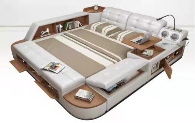 ¡Introducimos las ultramodernas Camas Modernas Hotel Multifunción Cama Doble de Lujo Diseño de Cuero, diseñadas para brindarte una experiencia de descanso de lujo y funcionalidad excepcional! Con una superficie de colchón de aproximadamente 180cm x 200cm y un tamaño de cama de aproximadamente 260cm x 264cm x 85/95cm, estas camas elevan el concepto de confort a un nivel completamente nuevo. Equipadas con asiento acolchado, compartimentos con cajones, mesa ajustable, conexión USB y Bluetooth, estas camas no solo te ofrecen un lugar para descansar, sino también un centro de entretenimiento personalizado.