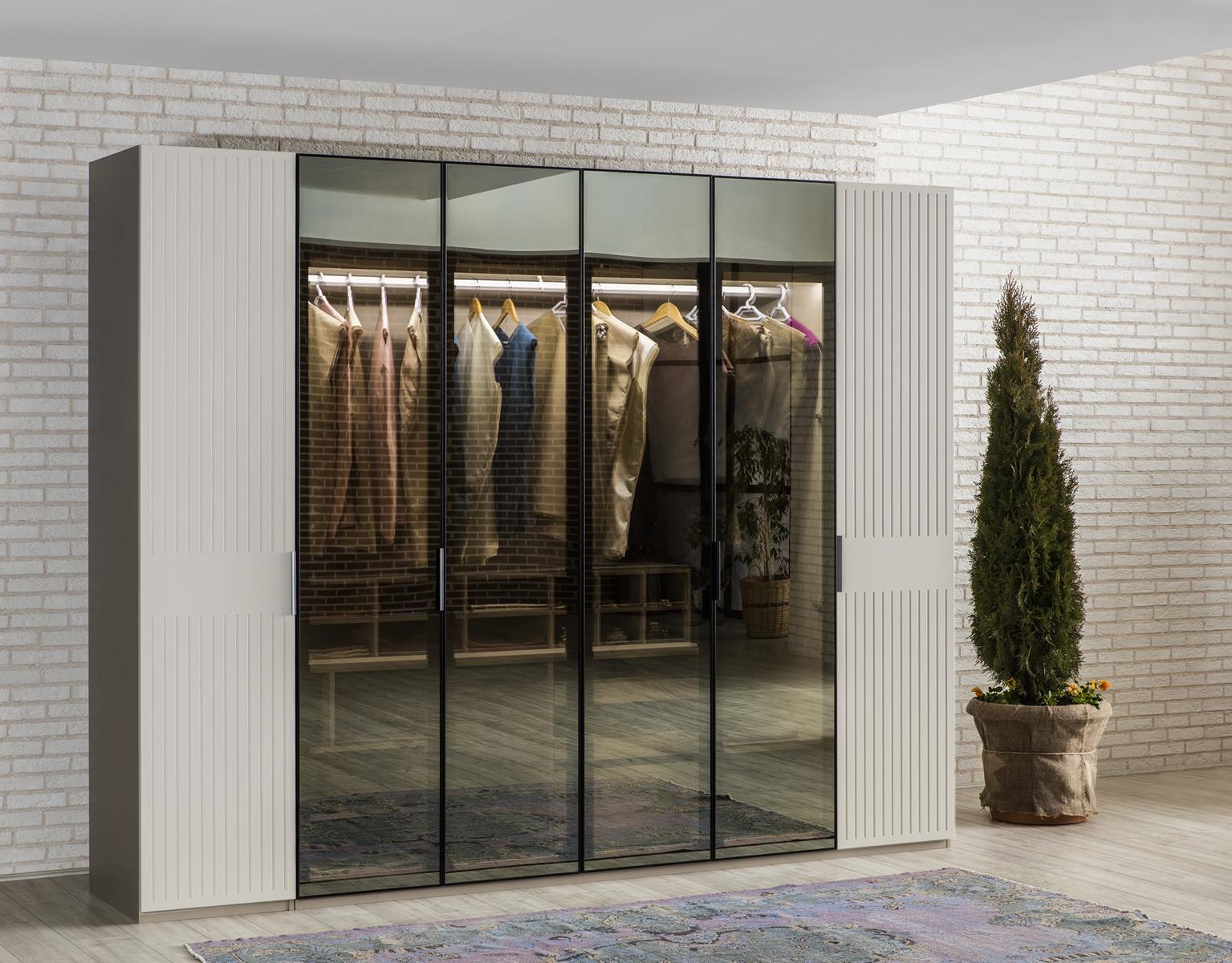 Conjunto completo de dormitorio gris claro, cama, armario, mesitas de noche, 7 piezas.