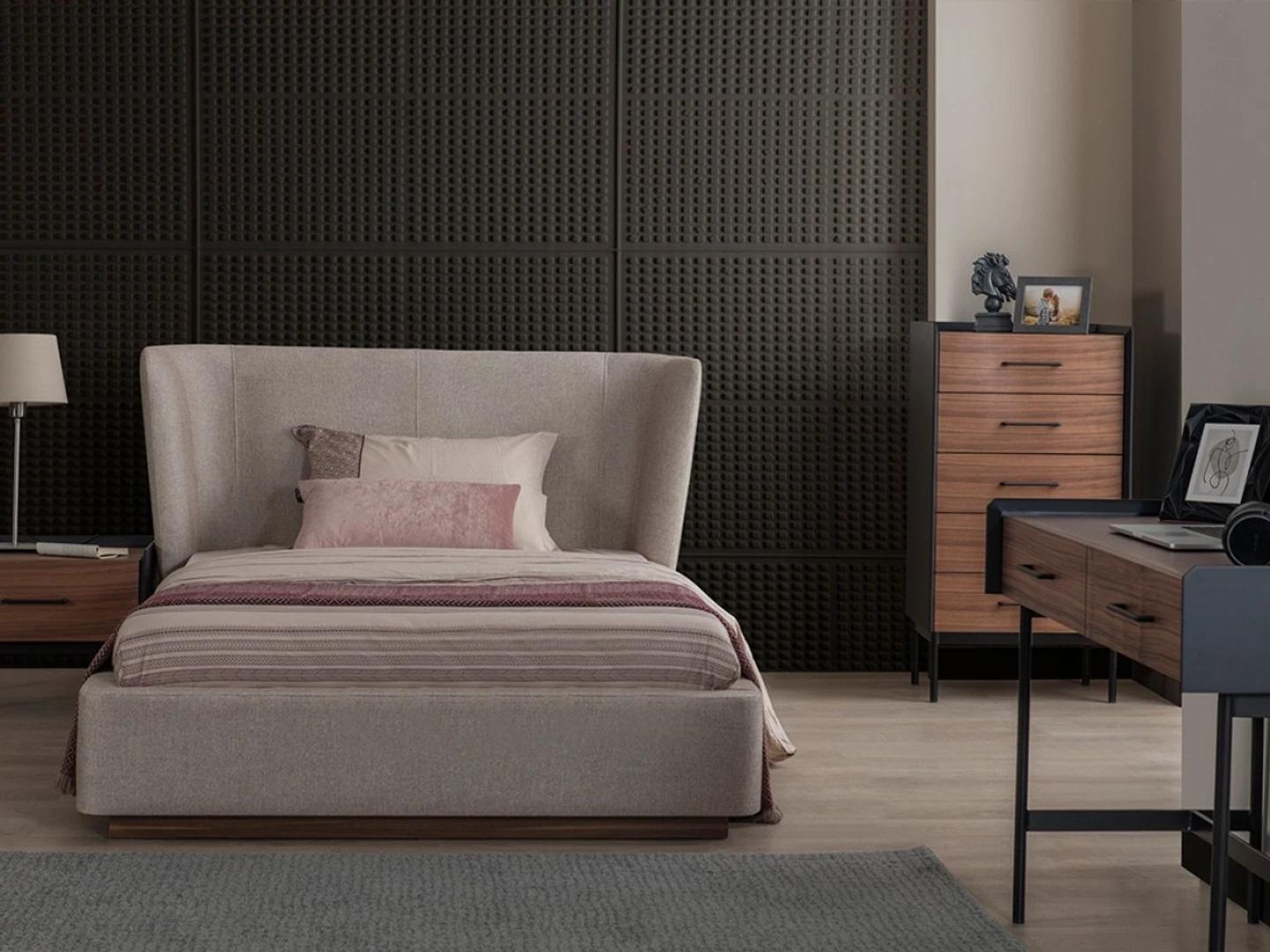 Conjunto de dormitorio de lujo con cama completa moderna y mesita de noche de madera de 2 piezas.