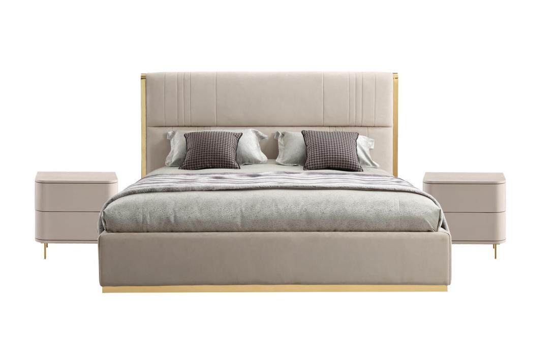 Dormitorio, Cama, Gris, Metal, Tela, Diseño, Lujo, 2 mesitas de noche, 3 piezas, Nuevo