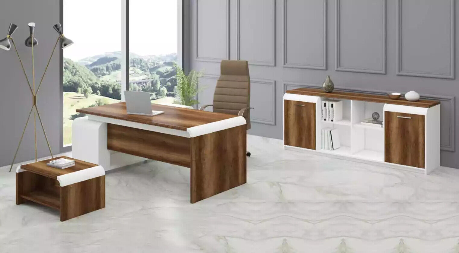 Set de muebles de oficina, equipamiento de oficina, escritorio, archivador, armario, lujo.
