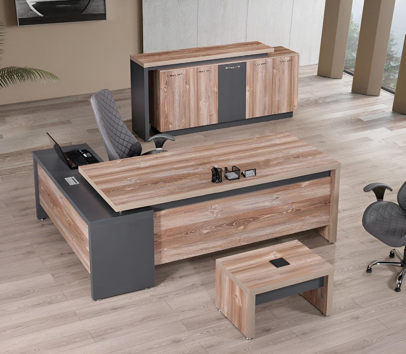 Con el escritorio de esquina podrás aprovechar al máximo el espacio disponible, creando un ambiente seguro y eficiente para tus tareas diarias. La mesa de café se convierte en un punto de encuentro perfecto para reuniones informales o momentos de relax. Por su parte, el armario ofrece un amplio espacio de almacenamiento para mantener tus documentos y material de oficina ordenados y accesibles. El diseño en madera gris de estos muebles aporta un toque moderno y elegante a tu ambiente laboral, potenciando tu concentración y eficiencia. Con este juego completo de muebles de oficina, trabajar desde casa nunca había sido tan cómodo y estiloso.
