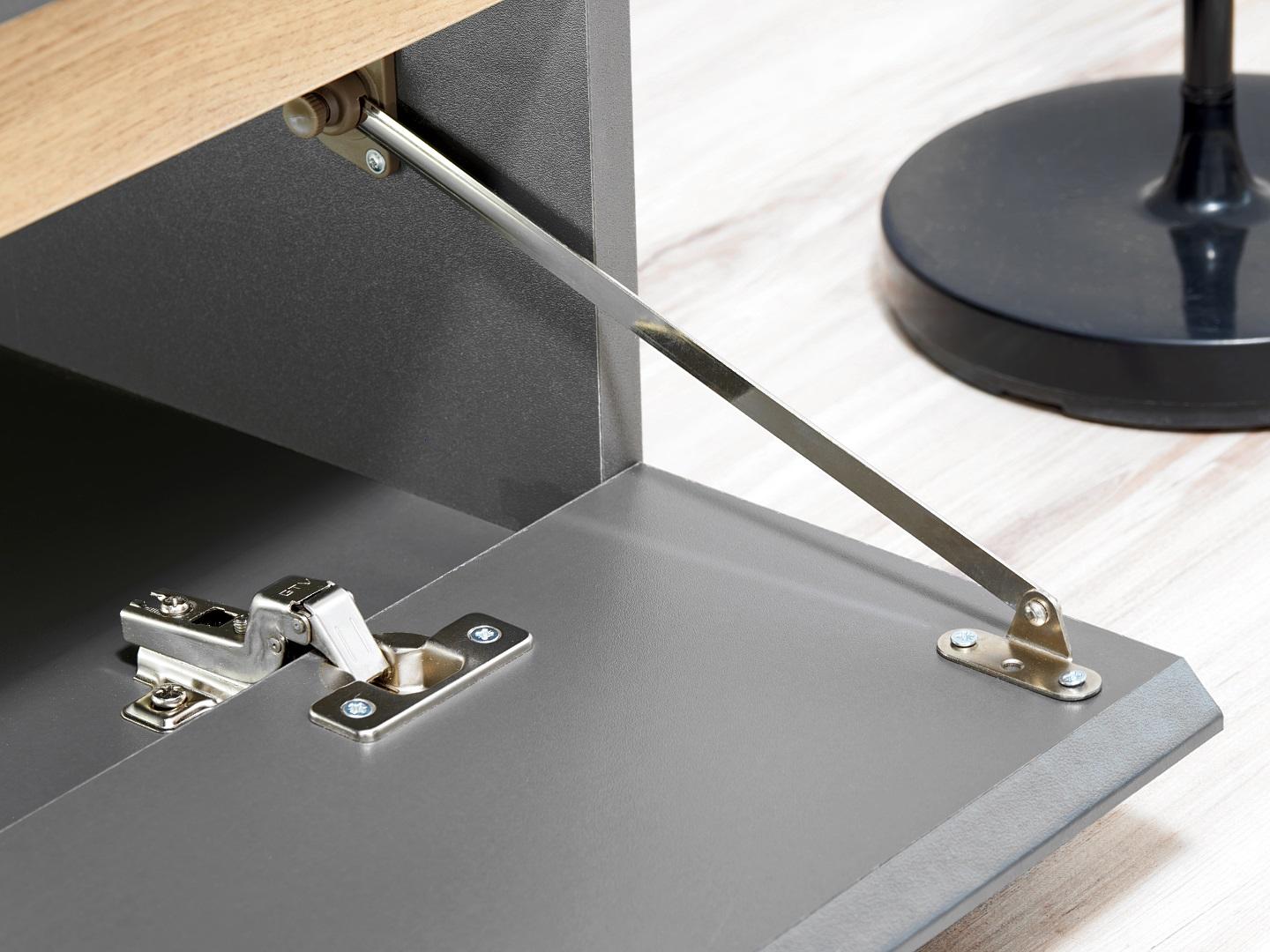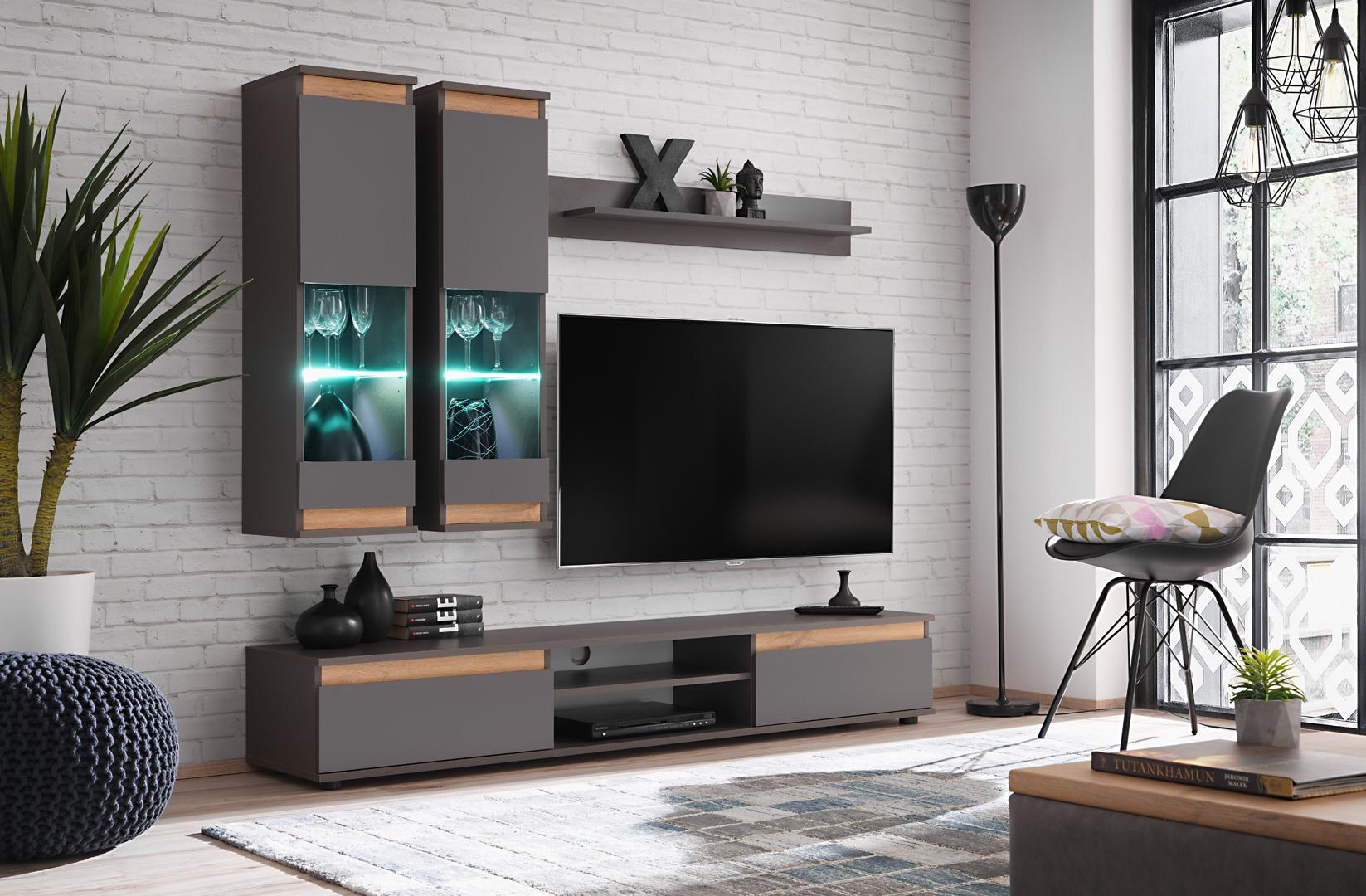 Mueble de televisión de pared de lujo de madera en gris, diseño de sala de estar.