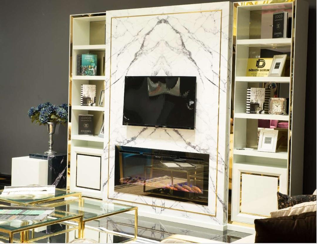 Exclusiva solución de vida RTV Blanco radiante y dorado en la pared de la sala.