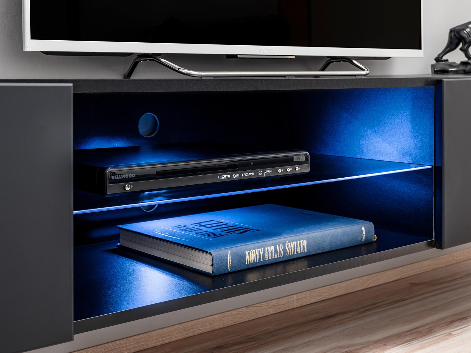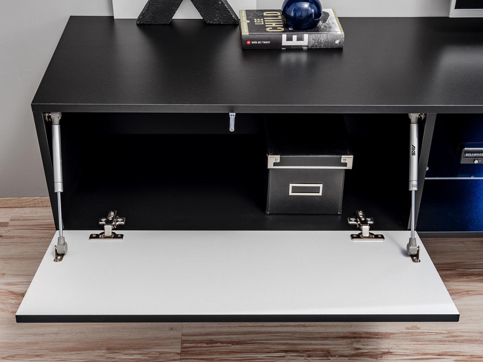 Mueble de salón negro con chimenea, diseño moderno, mueble de TV.