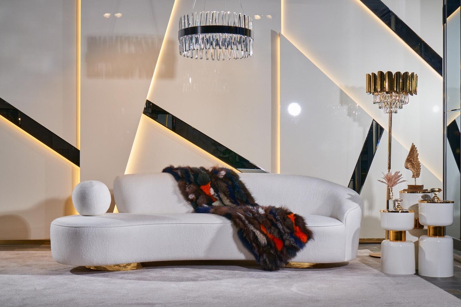 Sofá moderno blanco de lujo tapizado de 3 plazas con mesa de centro semicircular de 2 piezas.