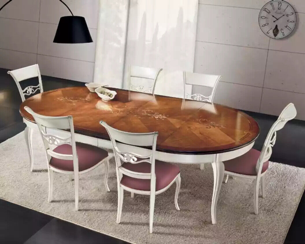 Esta mesa de comedor clásica de madera es el complemento perfecto para tu hogar. Con un diámetro de aproximadamente 140 cm, **aprox. Ø 140 x 77 cm** de dimensiones, es ideal para reunir a tu familia o amigos para disfrutar de deliciosas comidas juntos. El conjunto incluye 4 sillas a juego, cada una con unas dimensiones de aproximadamente **52 x 60 x 105 cm**, brindando comodidad y estilo a tu espacio de comedor. El color blanco de este conjunto agrega luminosidad y frescura a cualquier ambiente, creando una atmósfera acogedora y elegante.