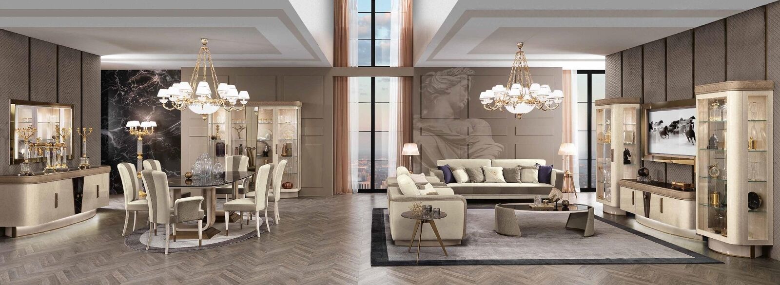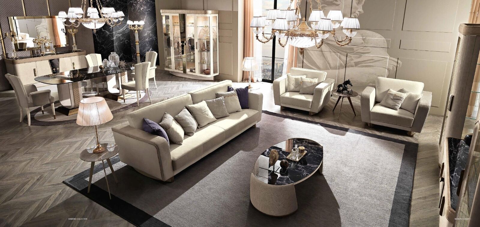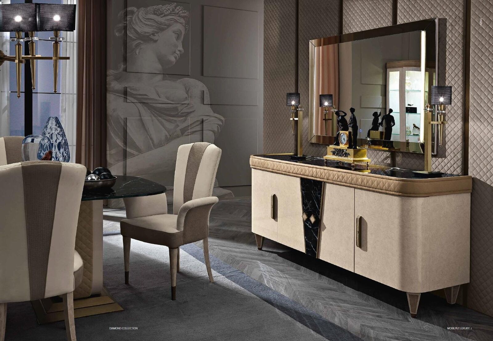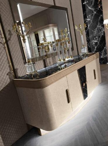 Cómoda con espejo Madera Muebles Cajón Armario Dormitorio Lujo Cómoda Nueva es una pieza de mobiliario de lujo que combina funcionalidad y estilo en un diseño elegante. Con sus dimensiones aproximadas de 207 x 55 x 90 cm, esta cómoda con espejo es el complemento perfecto para tu dormitorio. El aparador ofrece amplio espacio de almacenamiento con sus cajones y superficie de vidrio con efecto de mármol, brindando un toque de sofisticación a tu hogar. El espejo de 150 x 4 x 92 cm agrega un elemento de lujo y practicidad, convirtiendo esta pieza en un mueble imprescindible para cualquier habitación.