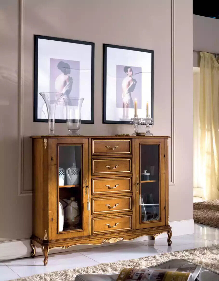 Vitrina de madera marrón exclusiva con cajones en estilo de muebles clásico.