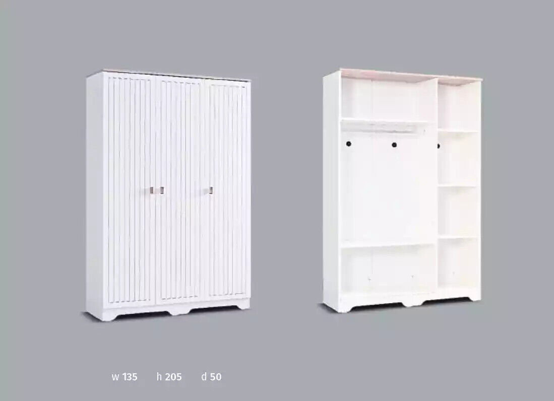 Con aproximadamente 135 cm de longitud, 205 cm de altura y 50 cm de ancho, este armario proporciona un amplio espacio para mantener todo en orden. Su color blanco neutro se adapta a cualquier decoración y el material de madera garantiza durabilidad y calidad. Ya sea en un dormitorio principal o en una habitación infantil, este armario es versátil y funcional, brindando estilo y organización a tu hogar.