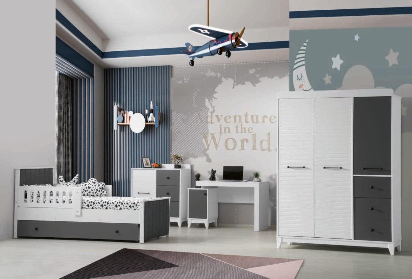 Conjunto de habitación infantil moderna compuesto por cama, armario, cómoda, y mesa de 4 piezas.