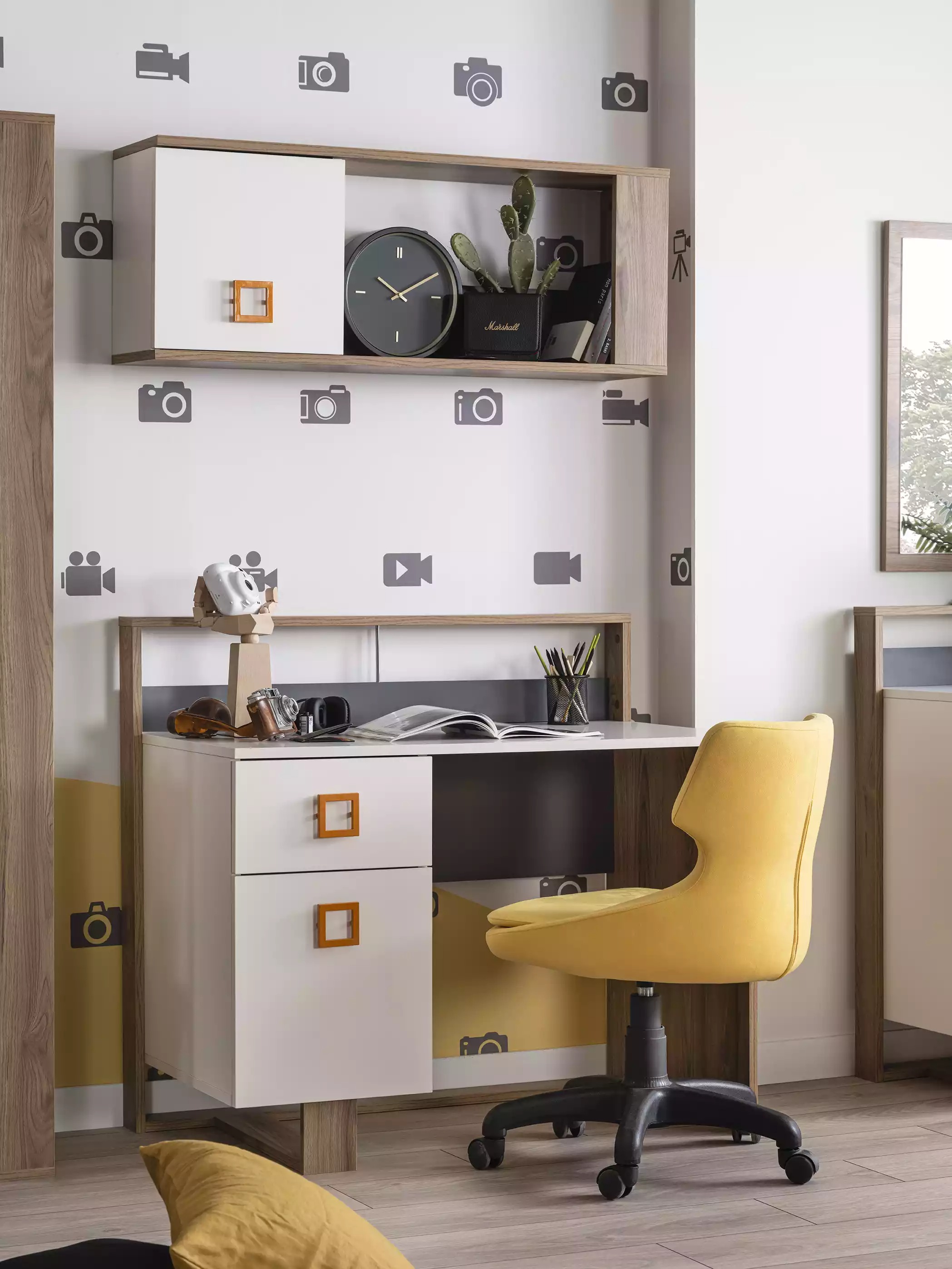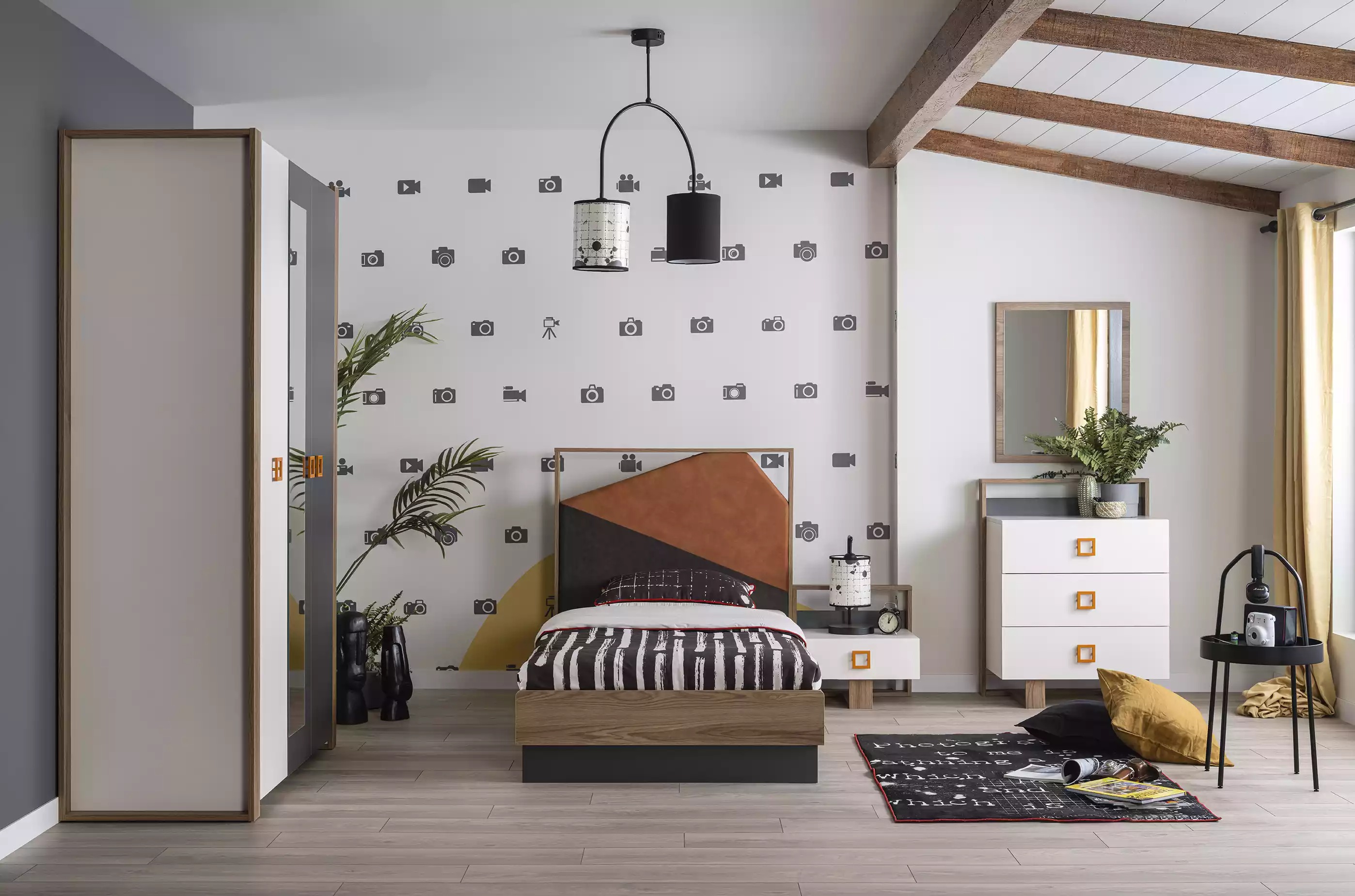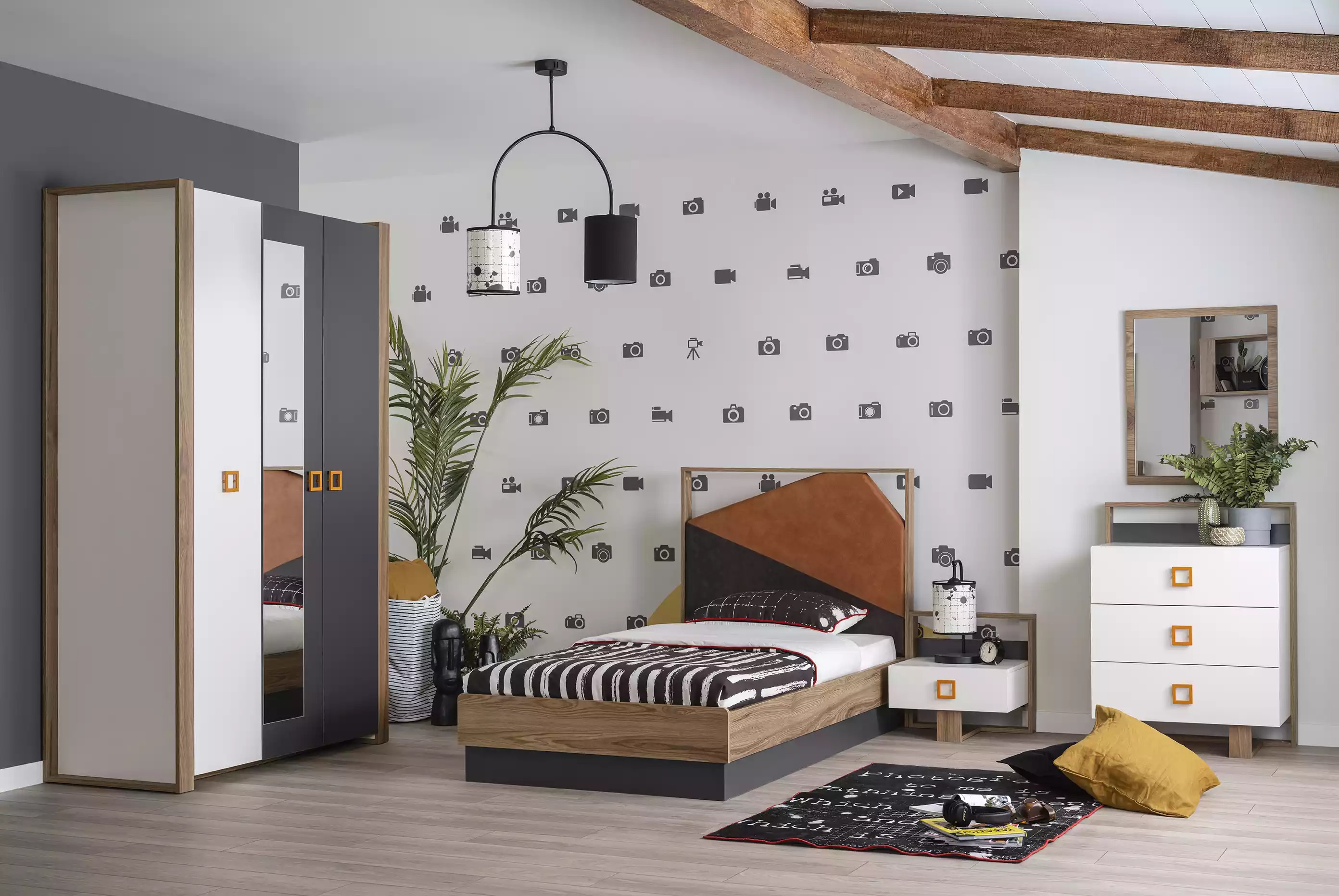 Además de la cama y el armario, este conjunto también cuenta con una mesita de noche, una cómoda, un espejo, un escritorio, dos estanterías y una silla, ofreciendo un ambiente completo para el descanso y estudio de los más pequeños. La gama de piezas permite una personalización versátil del espacio, adaptándose a las necesidades individuales y creando un entorno agradable y funcional para los niños. Con un diseño moderno y acabados de calidad, este conjunto de muebles encajará perfectamente en cualquier habitación infantil, proporcionando comodidad y estilo a partes iguales.
