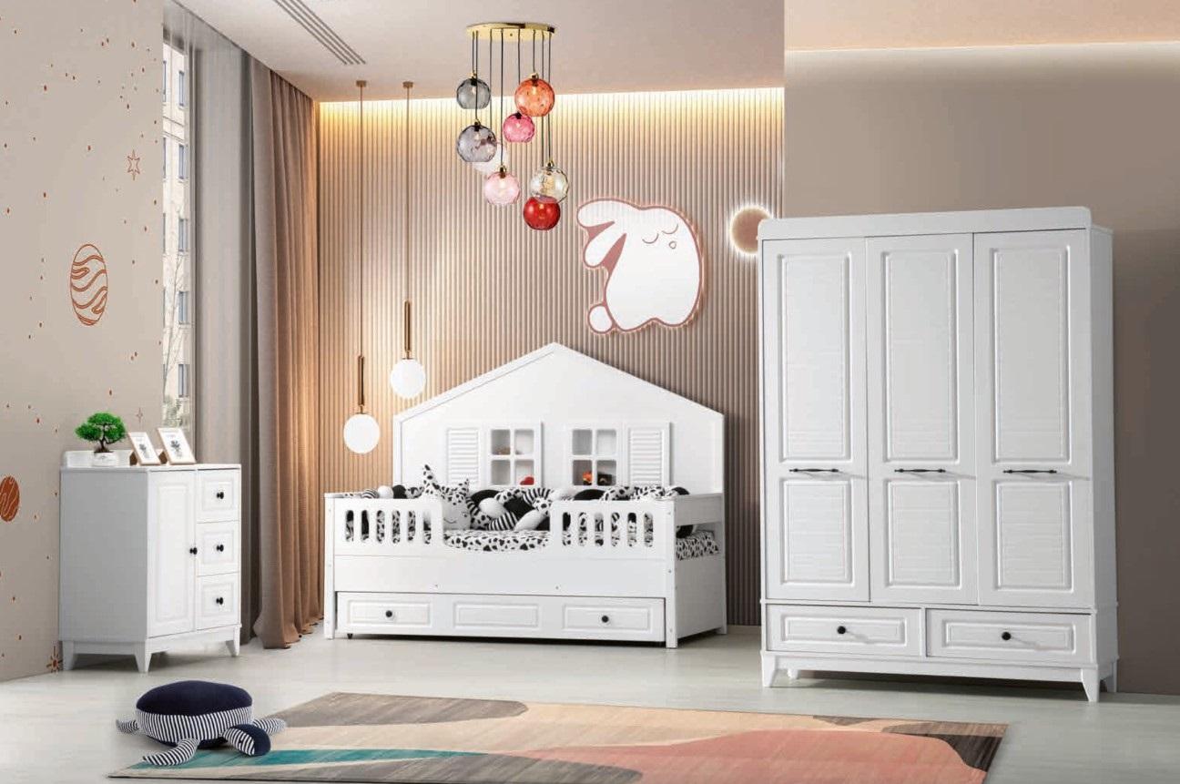 Elegante conjunto completo de habitación juvenil de lujo de 3 piezas en color blanco.