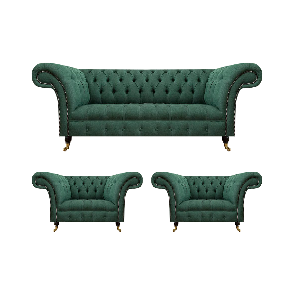 Conjunto completo de salón de 3 piezas, 2 sillones con sofá de tres plazas Chesterfield.