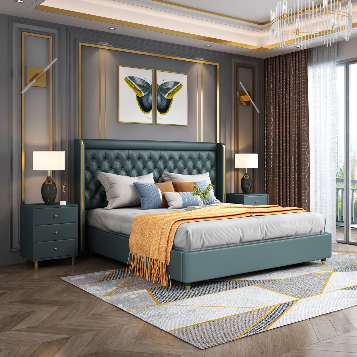 Dormitorio Cama Mesitas de noche 3 piezas. Set Diseño Decoración Lujo Camas Cuero