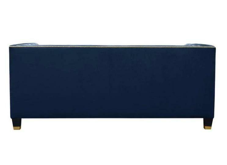 Chesterfield conjunto de sofá azul de 3 piezas con tapicería de asientos y cojines.