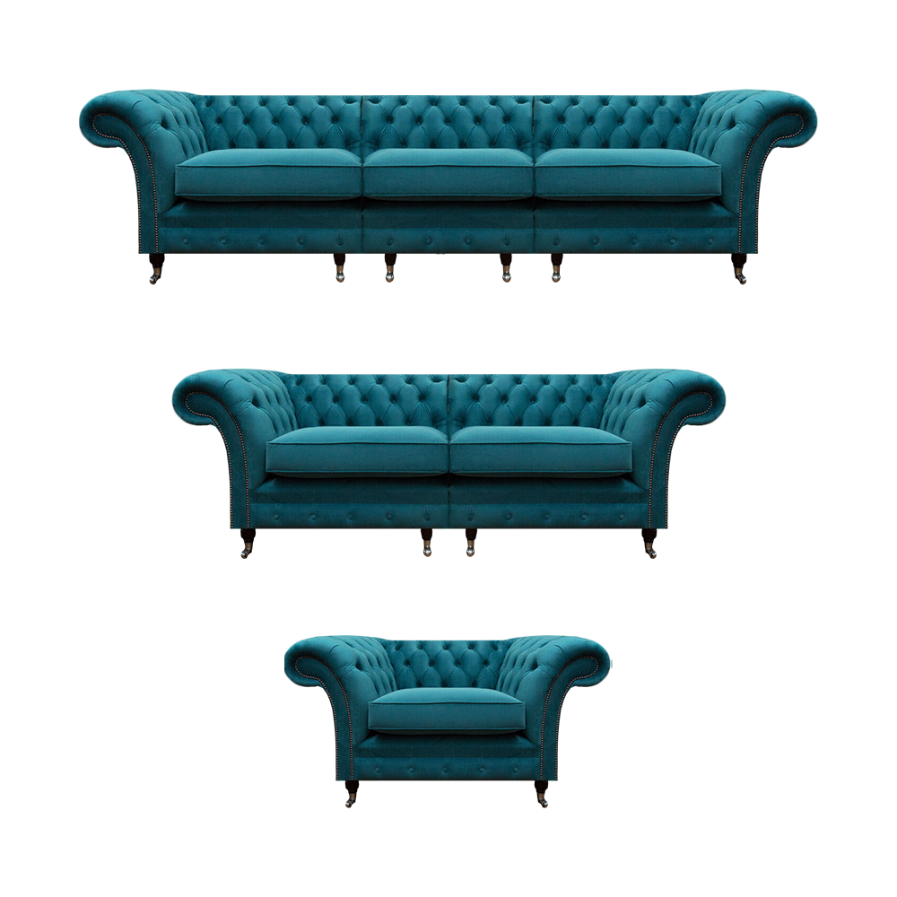 Conjunto de lujo de 3 piezas de sofás tapizados, sillón y sofá Chesterfield para la sala de estar.
