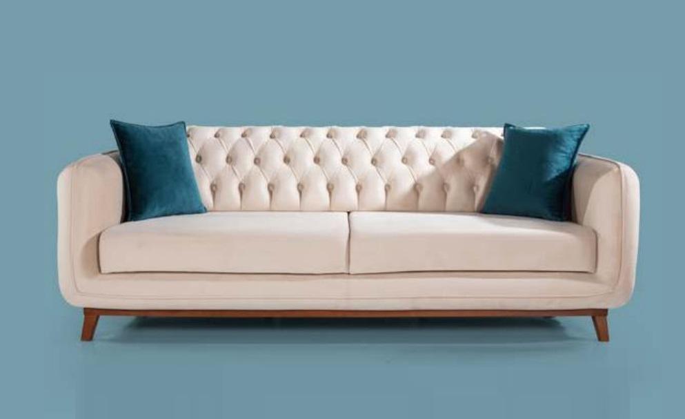 Sofá de tres plazas, sofá tapizado, muebles de tela beige y blanco, terciopelo