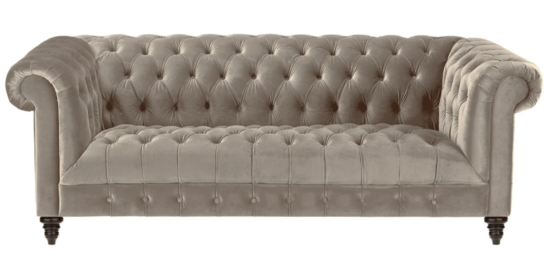 Sofá de terciopelo beige de lujo Chesterfield con botones, de tres plazas.