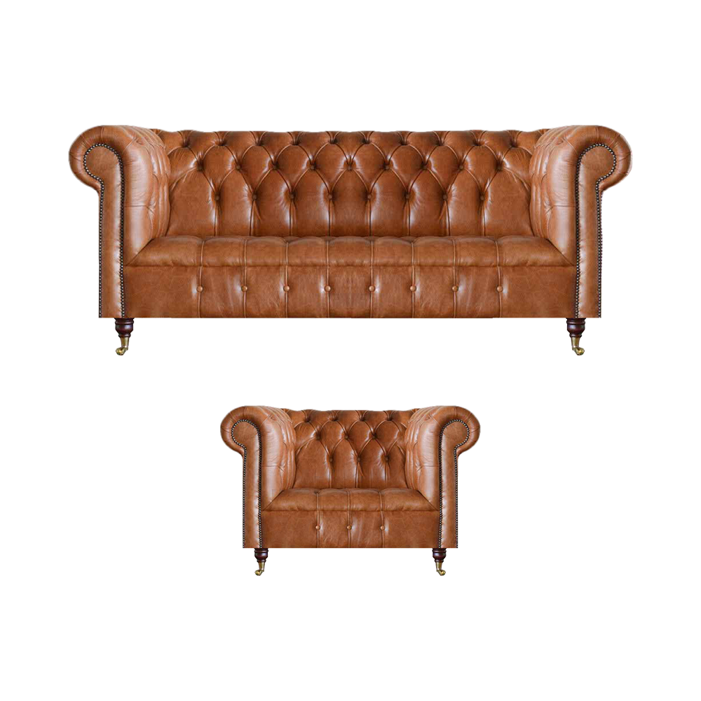Sofás de cuero Chesterfield marrones elegantes, conjunto completo de sofás de 2 piezas.
