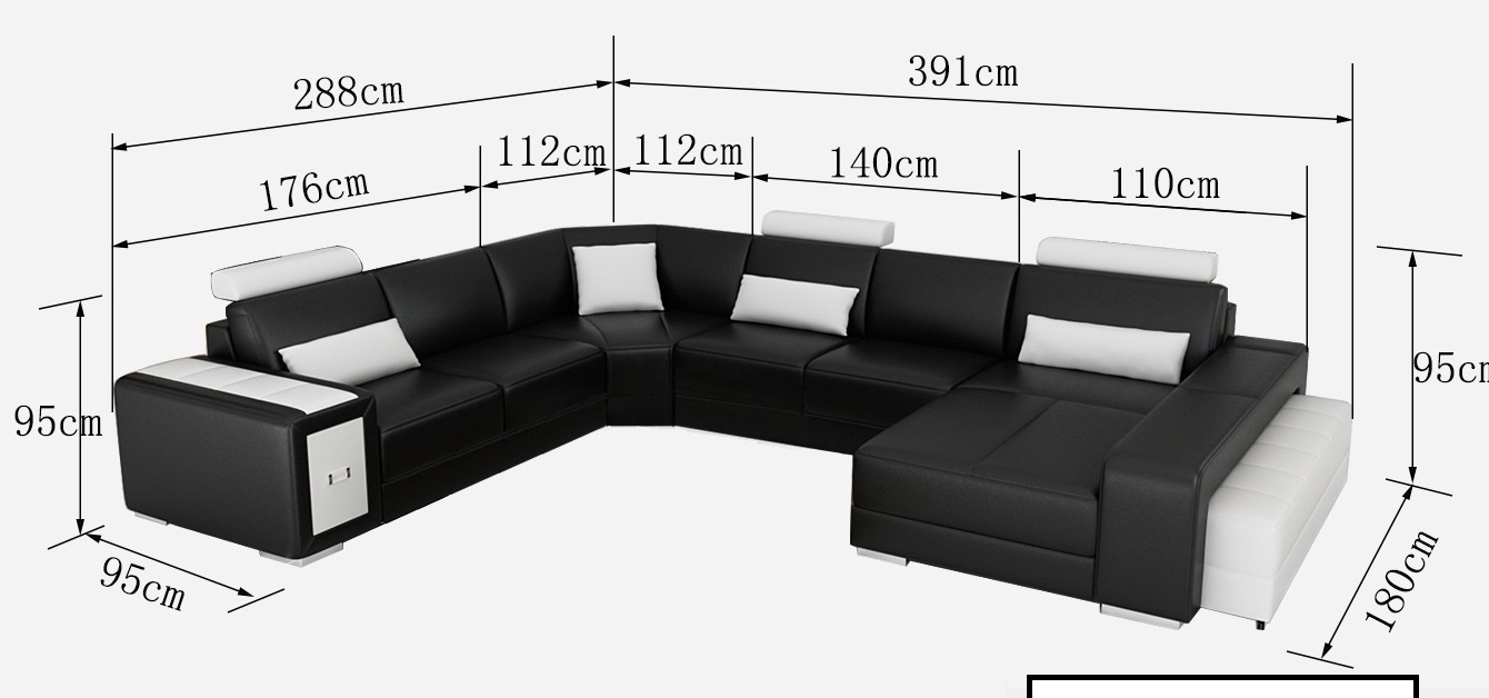 Con este sofá de esquina, puedes crear un ambiente acogedor y moderno en tu sala de estar. El tejido de fibra de cuero premium (70% cuero / 30% poliéster) ofrece durabilidad y elegancia. Además, puedes personalizar aún más tu sofá con opciones como el reposapiés eléctrico (+399 EUR) para disfrutar de un momento de relax total, y el sistema de sonido (2x altavoces + USB + sistema Bluetooth) (+399,00 EUR) para disfrutar de tu música favorita directamente desde tu sofá. Con opciones adicionales como la iluminación inferior con control remoto y el diseño en cuero genuino premium, este conjunto de muebles de salón con USB nuevo es la combinación perfecta de confort y estilo. ¡Crea un espacio de entretenimiento único con este sofá de esquina de diseño!