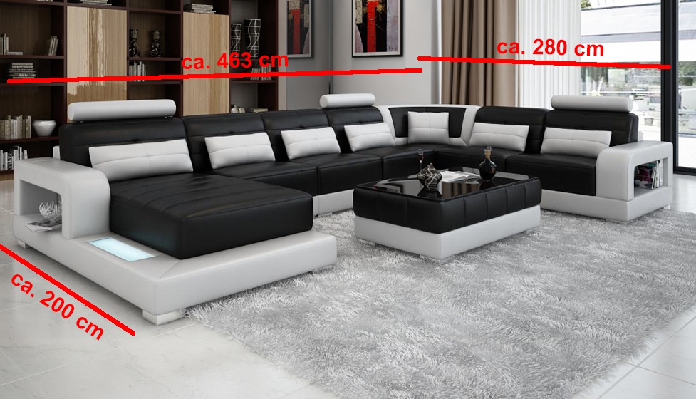 Comfort and style with our Modern XXL U-Shape sofa for the living room. Este sofá U-Shape XXL moderno ofrece una combinación perfecta de confort y estilo para tu sala de estar. Las medidas generosas de aproximadamente 200 x 463 x 280 cm y opción de función de cama por un coste adicional de 399 EUR garantizan un espacio amplio para relajarte y descansar. Con una elección de colores personalizada y acabado en cuero sintético Premium, este sofá no solo es elegante, sino también duradero y fácil de limpiar.