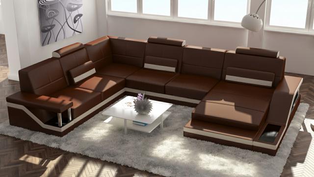 Sofá esquinero en forma de U de diseñador con USB, conjunto de tapizados, sofá esquinero: Este sofá de diseño moderno y elegante está equipado con automática de clic USB (3x conexión) INCLUIDA, lo que lo convierte en una pieza funcional y conveniente para tu hogar. Sus dimensiones aproximadas de 277 x 368 x 207 cm o 207 x 368 x 277 cm y su altura de aproximadamente 95 cm lo hacen ideal para espacios amplios, brindando comodidad y estilo a tus interiores. El material premium de 70% cuero / 30% poliéster garantiza durabilidad y sofisticación en cada detalle.
