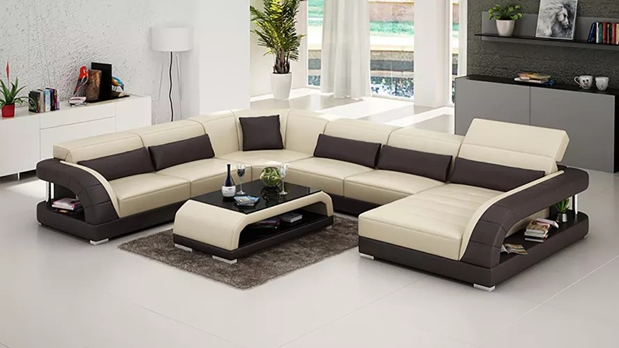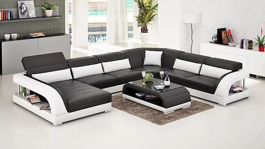 Conjunto de muebles, sofá esquinero y mesa, materiales de alta calidad, estilo moderno.