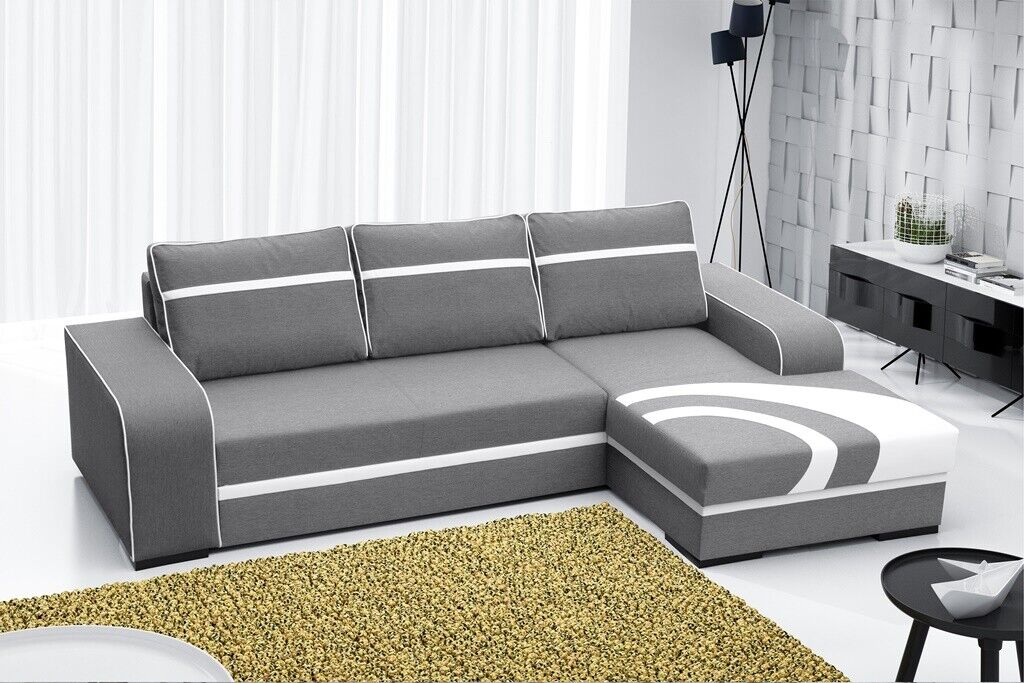 Con el Sofá cama esquinero, también puedes disfrutar de opciones de tapizado premium en tela o cuero sintético de diferentes grupos con costos adicionales, lo que te permite personalizar tu sofá según tus preferencias. La iluminación LED en la parte inferior por un costo adicional de + 99,00EUR agrega un toque moderno y elegante a tu sala de estar. La estructura interna de madera real garantiza durabilidad y calidad, mientras que los resortes de muelle proporcionan un soporte cómodo. Ya sea como un cómodo espacio de descanso diario o una cama adicional para visitantes, este sofá esquinero multifuncional es ideal para cualquier hogar moderno.