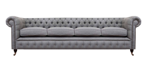 Chesterfield sofá de cuatro plazas en gris, nuevo, diseño de salón, tela.