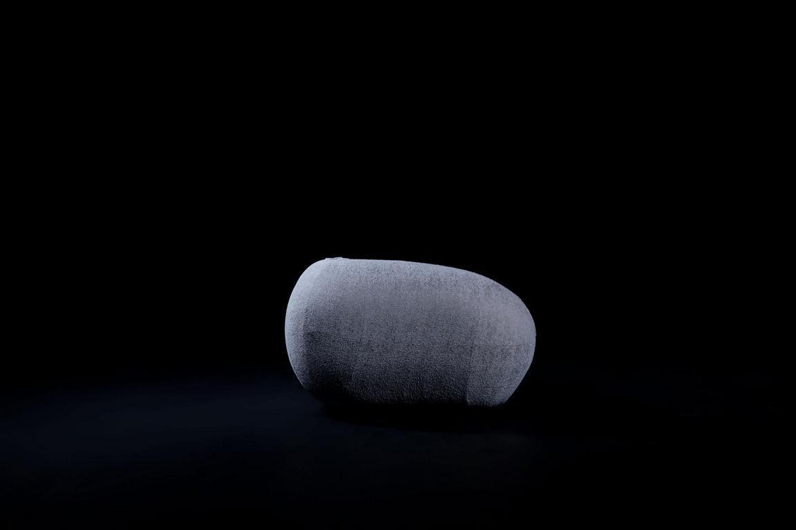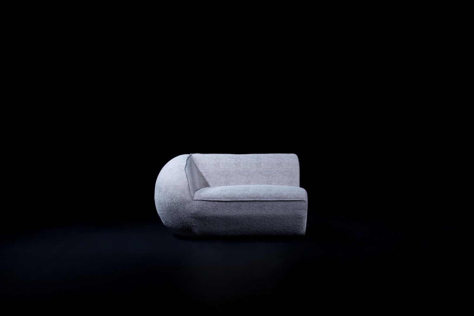 Sofá esquinero moderno de seis plazas en tela acolchada de color gris.